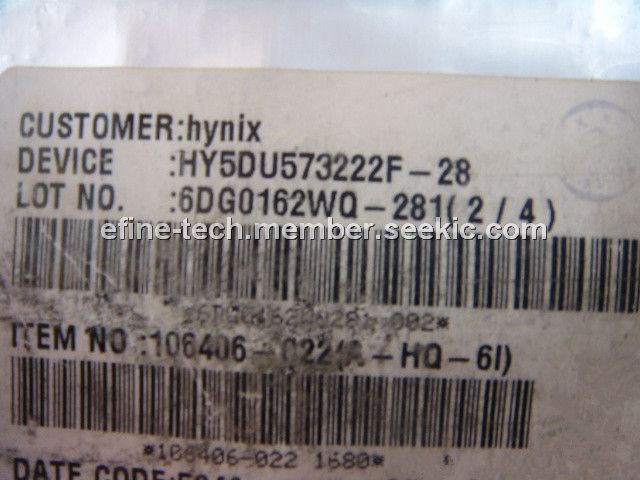 HY5DU573222F-28 features: (1)The Hynix HY5DU573222F(P) guarantee until ; (2)200MHz speed at DLL_off condition; (3)2.5V VDD and VDDQ wide range max power supply supports; (4)All inputs and outputs are compatible with SSTL_2 interface; (5)12mm x 12mm, 144ball FBGA with 0.8mm pin pitch; (6)Fully differential clock inputs (CK, /CK) operation; (7)Double data rate interface; (8)Source synchronous - data transaction aligned to bidirectional data strobe (DQS0 ~ DQS3) ; (9)Data outputs on DQS edges when read (edged DQ) Data inputs on DQS centers when write (centered DQ); (10)Data(DQ) and Write masks(DM) latched on the both rising and falling edges of the data strobe; (11)All addresses and control inputs except Data, Data strobes and Data masks latched on the rising edges of the clock; (12)Write mask byte controls by DM (DM0 ~ DM3); (13)Programmable /CAS Latency 5 / 4 / 3 supported; (14)Programmable Burst Length 2 / 4 / 8 with both sequential and interleave mode; (15)Internal 4 bank operations with single pulsed /RAS; (16)tRAS Lock-Out function supported; (17)Auto refresh and self refresh supported; (18)4096 refresh cycles / 32ms; (19)Half strength and Matched Impedance driver option.
